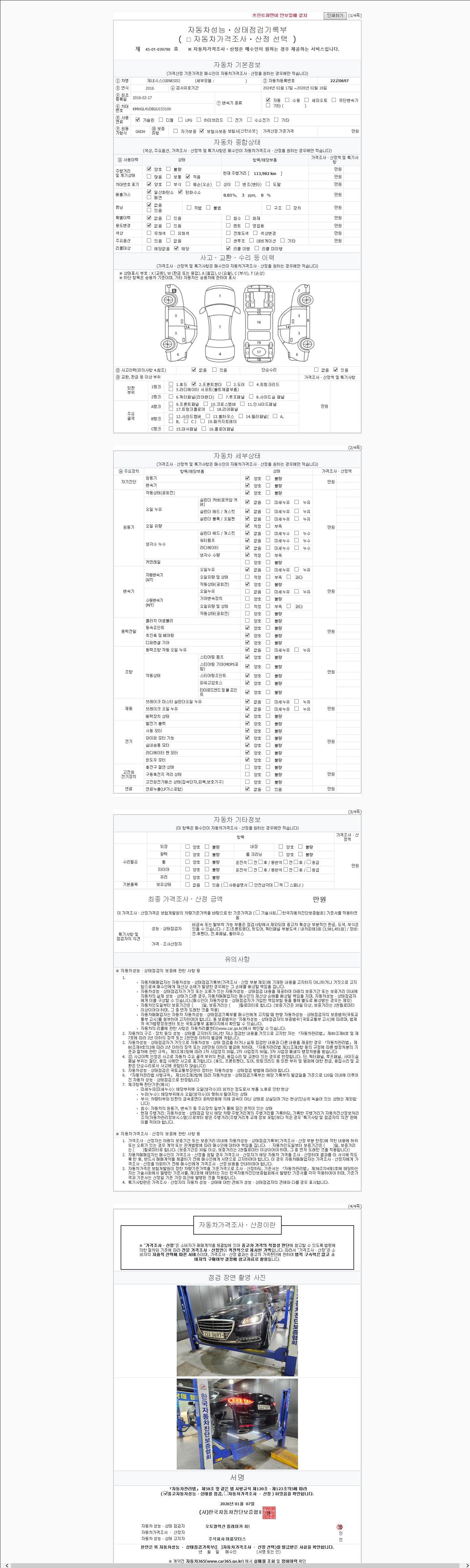 | 주행거리 | 113,961 km | 차량번호 | 22고0697 | 사고유무 | 성능기록부 참조 | 제시번호 | 제 2147483647 호 |