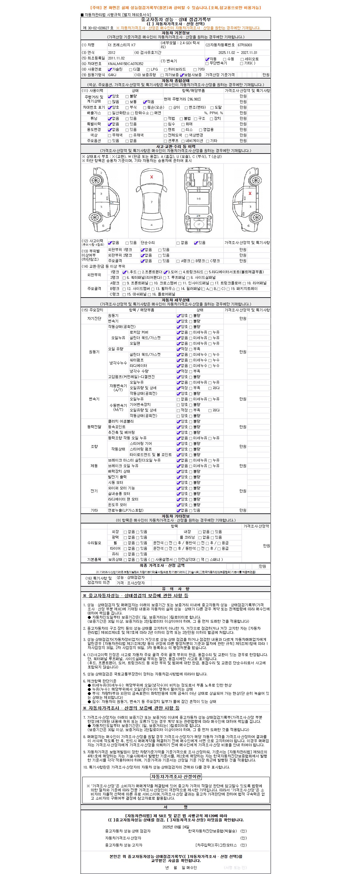 자동차관리법 시행규칙 제120조의 규정에 따라 별지 제 82호서식 《중고자동차 성능, 상태점검 기록부》를 발행한 성능, 상태점검자 및 매매자는 아래의 보증기간 또는 보증거리 이내의 중고자동차, 성능점검 기록부에 기재된 내용과 자동차의 실제 성능, 상태가 다른 경우 계약 또는 관계법령에 따라 매수인에 대하여 책임을 집니다.
