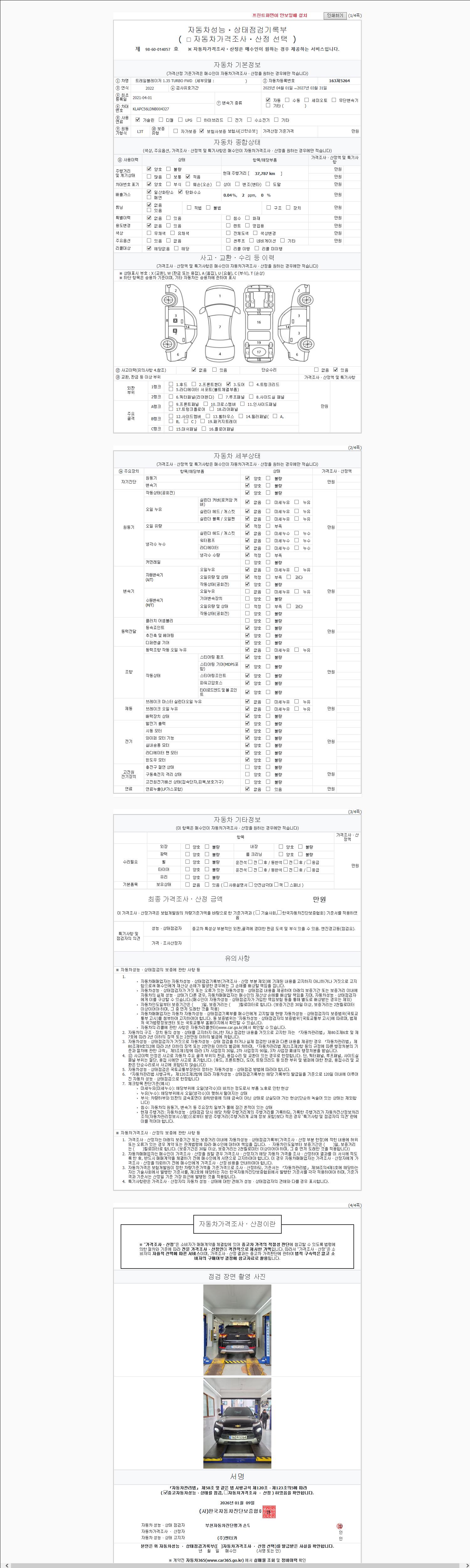 | 주행거리 | 37,800 km | 차량번호 | 163저5264 | 사고유무 | 성능기록부 참조 | 제시번호 | 제 2026002164 호 |