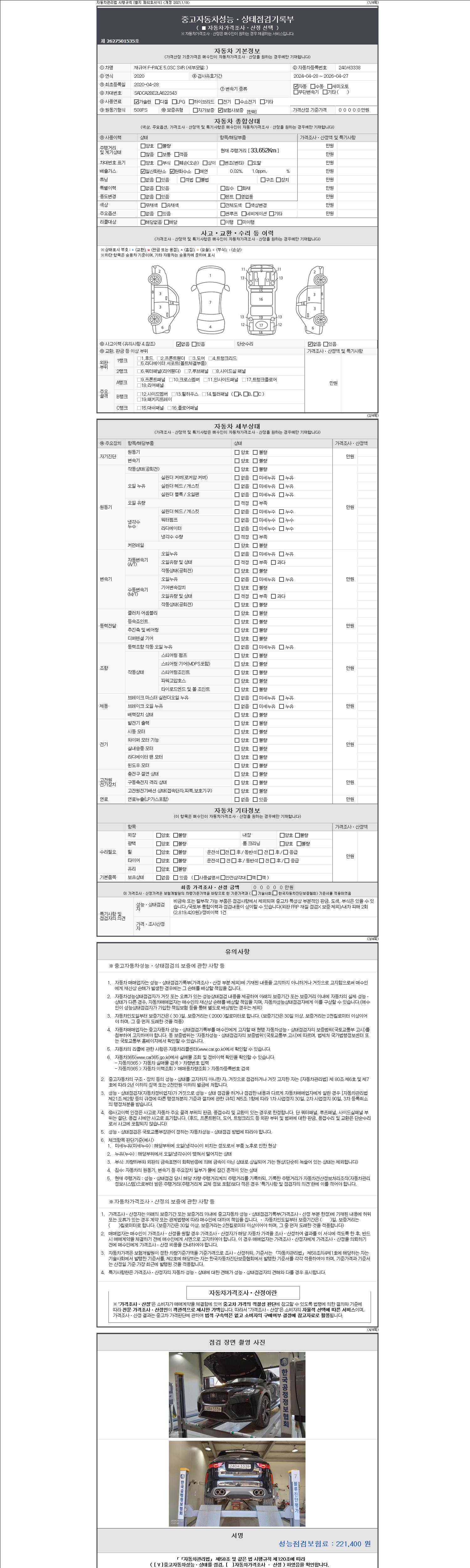 | 주행거리 | 33,652 km | 차량번호 | 240서3338 | 사고유무 | 성능기록부 참조 | 제시번호 | 제 2147483647 호 |