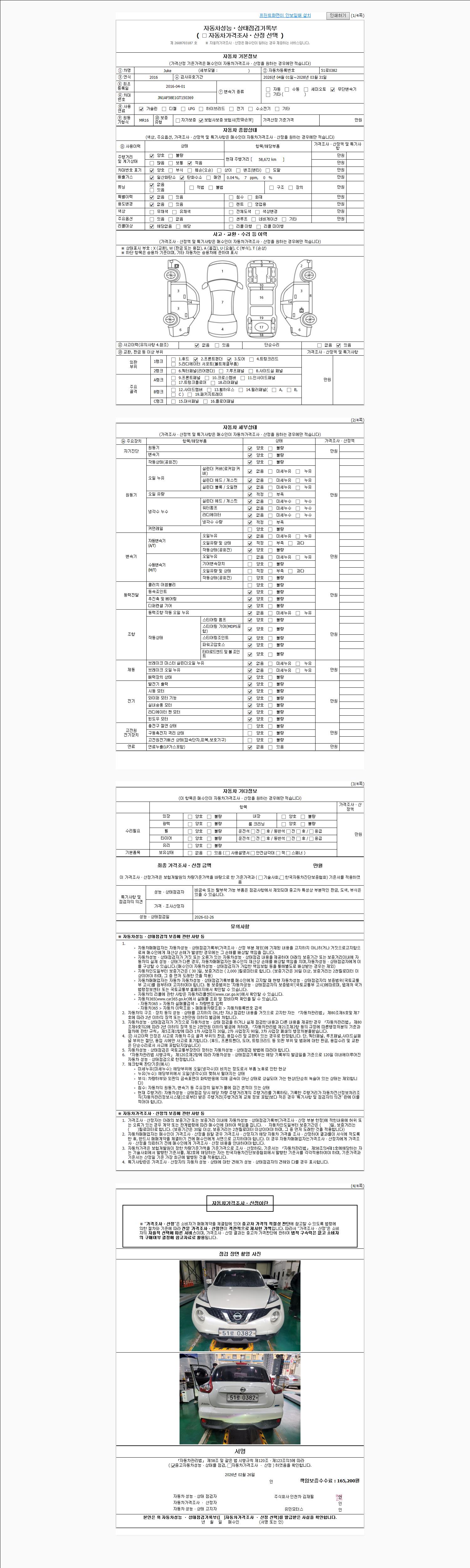 | 주행거리 | 58,672 km | 차량번호 | 51로0382 | 사고유무 | 성능기록부 참조 | 제시번호 | 제 2026010606 호 |